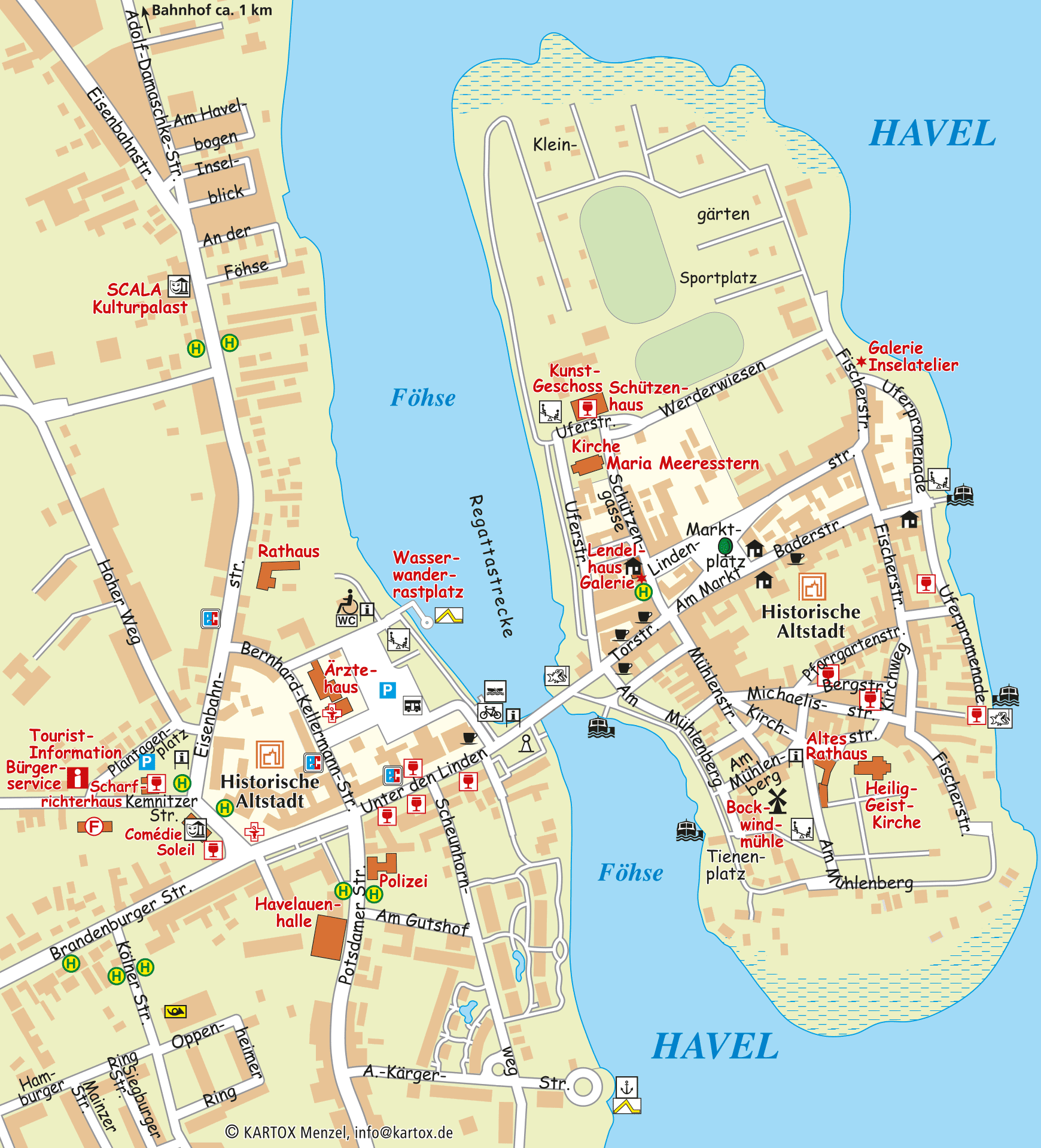 Karte der historischen Altstadt von Werder (Havel) mit der Inselstadt und wichtigen Zielen.