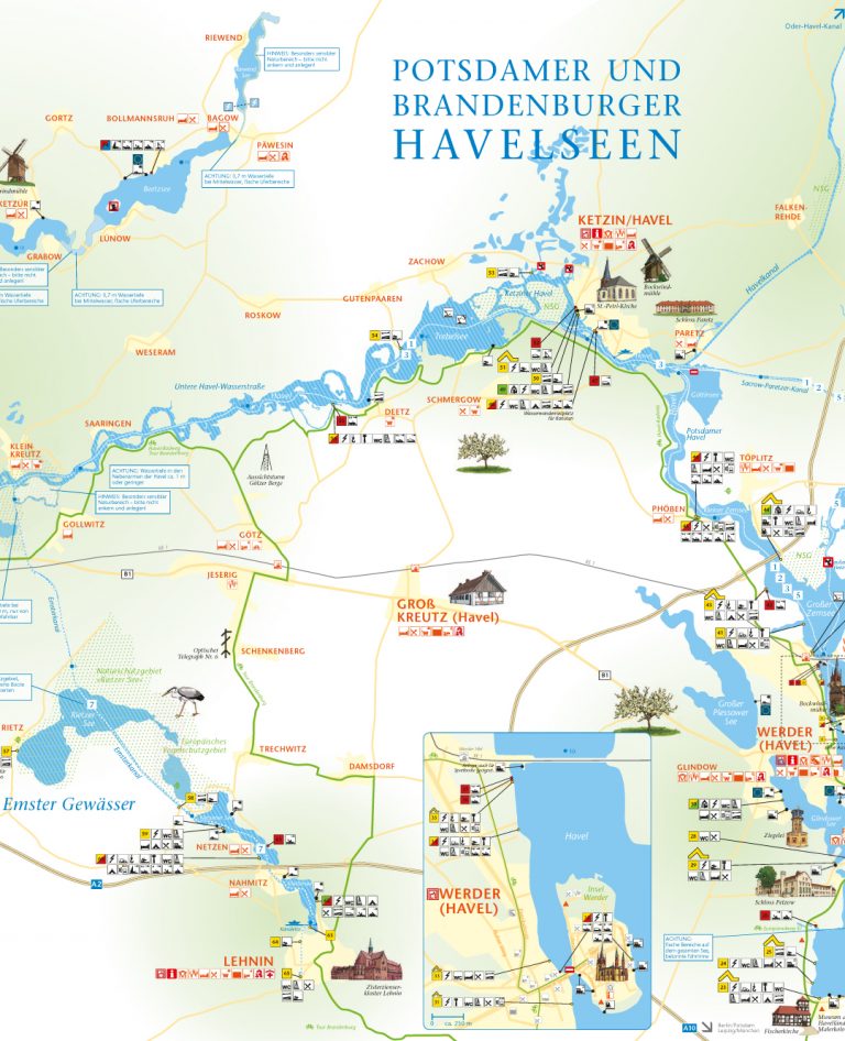 Leinen los und Schiff ahoi – das Revier der „Potsdamer und Brandenburger Havelseen“ ist Teil des „Blauen Paradieses“, Europas größtem zusammenhängenden Wassersportrevier zwischen Elbe und Oder, Ostsee und dem Spreewald. Und Werder ist mittendrin. Auf einer Gesamtlänge von rund 180 Kilometern bietet der Flusslauf der Havel mit mehr als 40 Seen, Kanälen und Havelarmen wunderschöne Möglichkeiten für einen Urlaub mit dem Boot. Ob unter Segeln, an Bord eines Motorbootes oder mit dem Kanu dem Wasser ganz nah – hier kann jeder seine individuelle Bootstour genießen.